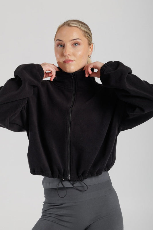 Full zip, drawstring and high neck.